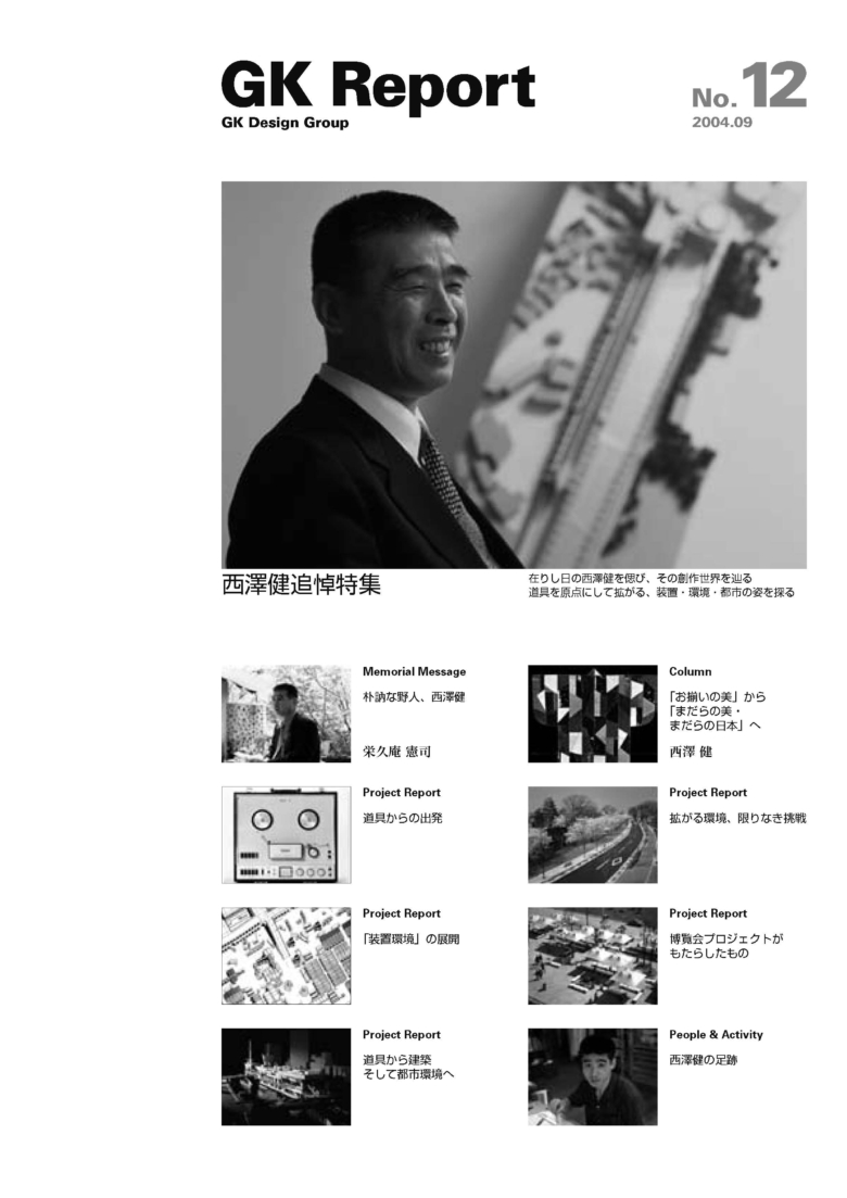 Preview PDF 2 MB No.12 / 2004.09 西澤健追悼特集 Memorial Message 『木訥な野人、西澤健』 『弔辞より』 『環境デザインの開拓者、西澤健さんを偲ぶ』 『問題意識を共有した親しき仲間へ』 『「お早う、西澤さん」』 『西澤さんとの思い出』 『ケテルの3分刈り』 『「惜別」』 『受け継ぎたい「価値創造の精神」』 Project Report 西澤健遺稿集 及び GKメンバーからのメッセージ 『道具からの出発』 『ポン・デザール(Pont des Arts)は語る』 西澤 健 『「環境装置」の展開』 『育てるデザイン』 西澤 健 『道具から建築そして都市環境へ』 『「お揃いの美」から「まだらの美・まだらの日本」へ』 西澤 健 『拡がる環境、限りなき挑戦』 『必要とされる個性と美意識』 西澤 健 『博覧会プロジェクトがもたらしたもの』 People & Activity 西澤健の足跡 Prev Page Next Page GK Report Index