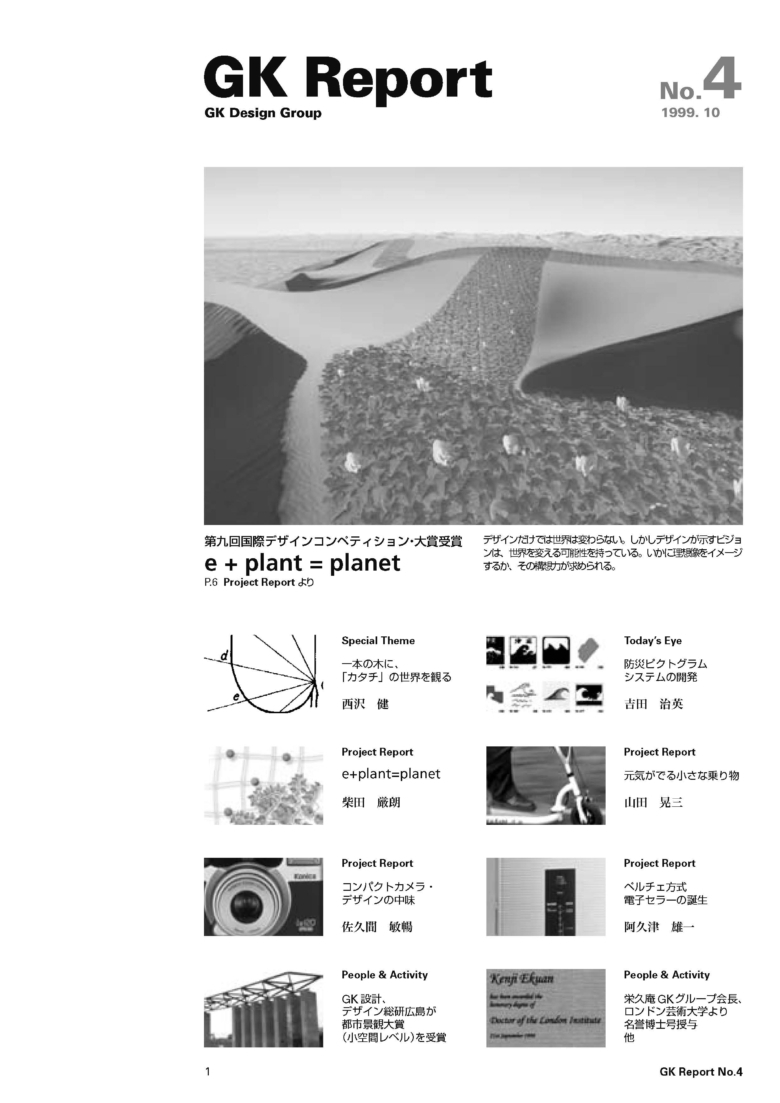 Preview PDF 1 MB No.4 / 1999.10 Special Theme 一本の木に、「カタチ」の世界を観る 西澤 健 Today's Eye 防災ピクトグラムシステムの開発 吉田 治英 Project Report e + plant = planet 柴田 厳朗 元気のよいプロダクト特集 元気がでる小さな乗り物 山田 晃三 コンパクトカメラ・デザインの中身 佐久間 敏暢 ペルチェ方式電子セラーの誕生 阿久津 雄一 People & Activity World Report GK設計、デザイン総研広島が、都市景観大賞の景観形成事例部門・小空間レベル受賞 栄久庵GKグループ代表、The London Instituteより名誉博士号授与 "Design for the World" 批准される Column デザイン真善美 栄久庵 憲司 Prev Page Next Page GK Report Index