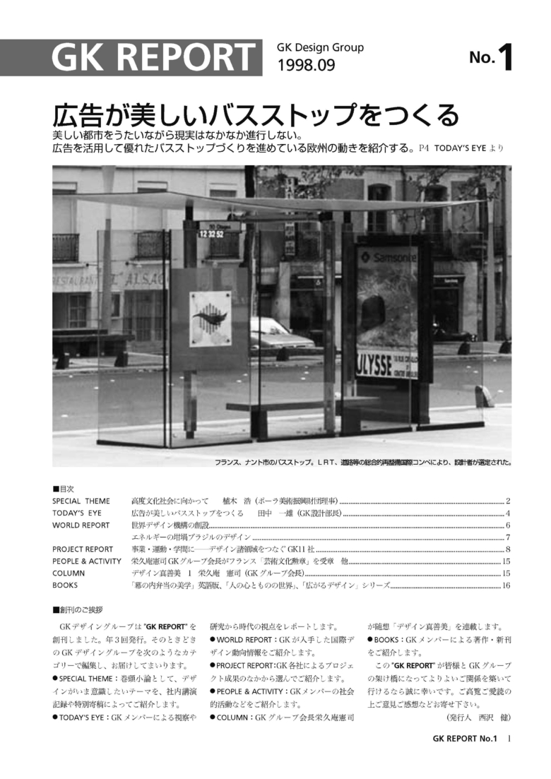 Preview PDF 970 KB No.1 / 1998.09 Special Theme 高度文化社会に向かって 植木 浩 Today's Eye 広告が美しいバスストップをつくる 田中 一雄 World Report 世界デザイン機構の創設 エネルギーの坩堝ブラジルのデザイン Project Report 事業・運動・学問に… デザインの諸領域をつなぐグループ11社 People & Activity Column 栄久庵憲司GKグループ会長がフランス「芸術文化勲章」を受章 デザイン真善美 栄久庵 憲司 Books 米国MITから栄久庵憲司著『幕の内弁当の美学』英語版を出版 ほるぷ出版社から栄久庵憲司著『人の心とものの世界…卓上醤油瓶から秋田新幹線「こまち」まで』を出版 鹿島出版会から『広がるデザイン』シリーズ全3巻を出版 Next Page GK Report Index
