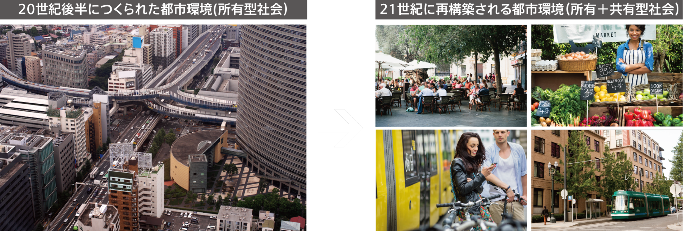 このため、私たちは都市部を再生する取組みでは、対象となるエリアはもとより、関係する周辺地域の様々なつながりについて考え、その共有価値の創造(CSV)に取り組み、エリア内の公園や道路などのオープンスペースや身近な自然、建築やモノ、情報や出来事がシンクロする場をデザインすることを目指します。