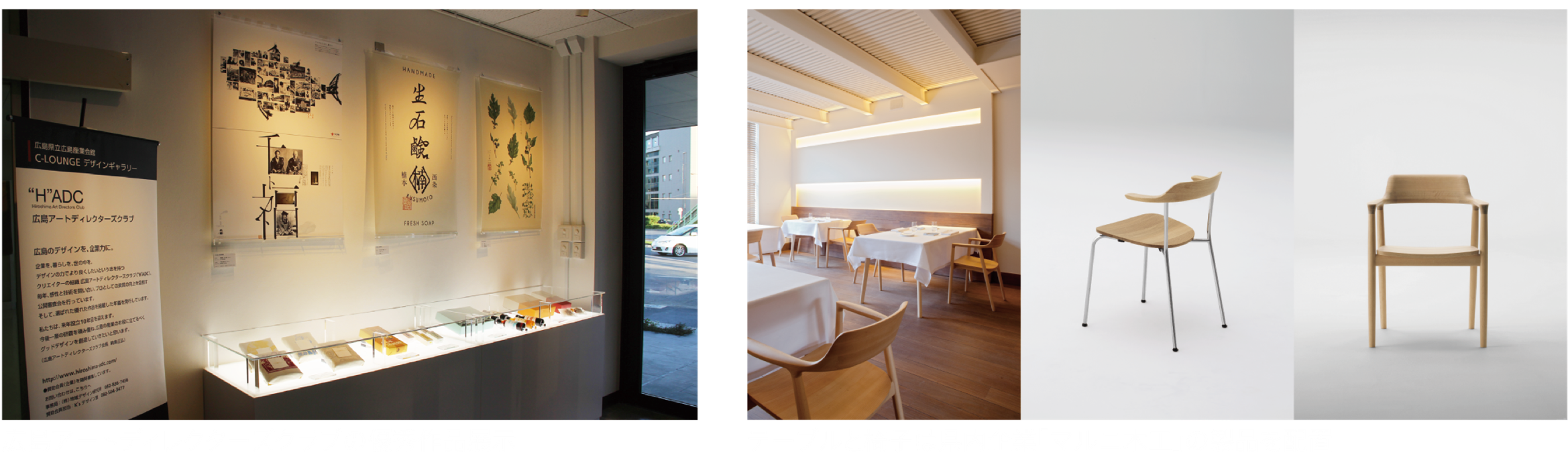 展示関係者から要望されていた商談スペースと、地元の新たなモノづくりを促進する企業とクリエイターの交流の場(クリエイティブ・カフェ等の開催の場)を設けるため、本館の食堂の一部を「C-Lounge」としてリニューアルしました。また、このラウンジは来訪者が県内企業の製品や県内在住のクリエイターのデザインや作品に自然に触れることができるよう、入り口周辺にクリエイターが手掛けた製品パッケージやポスター等の展示コーナーを設けており、テーブルや椅子は県内企業のマルニ木工の製品を使用しています。