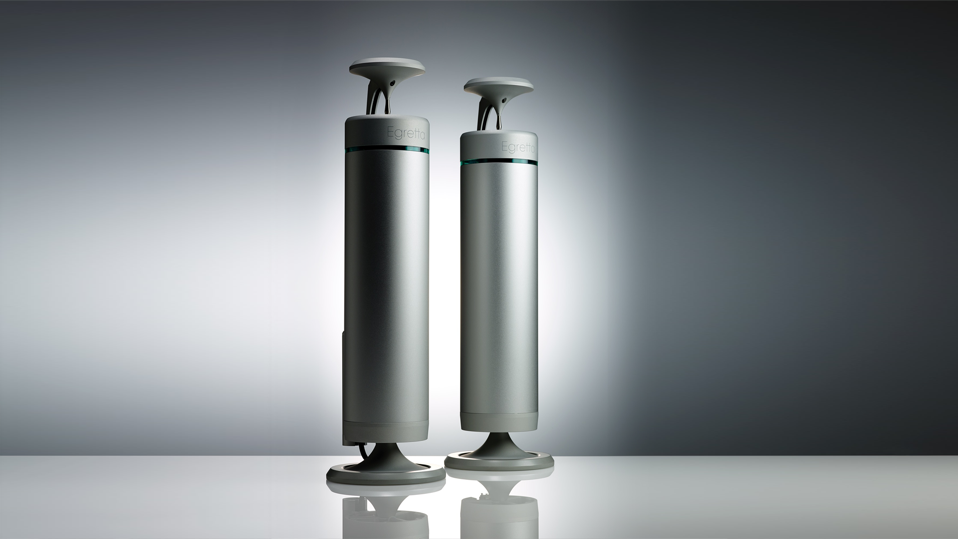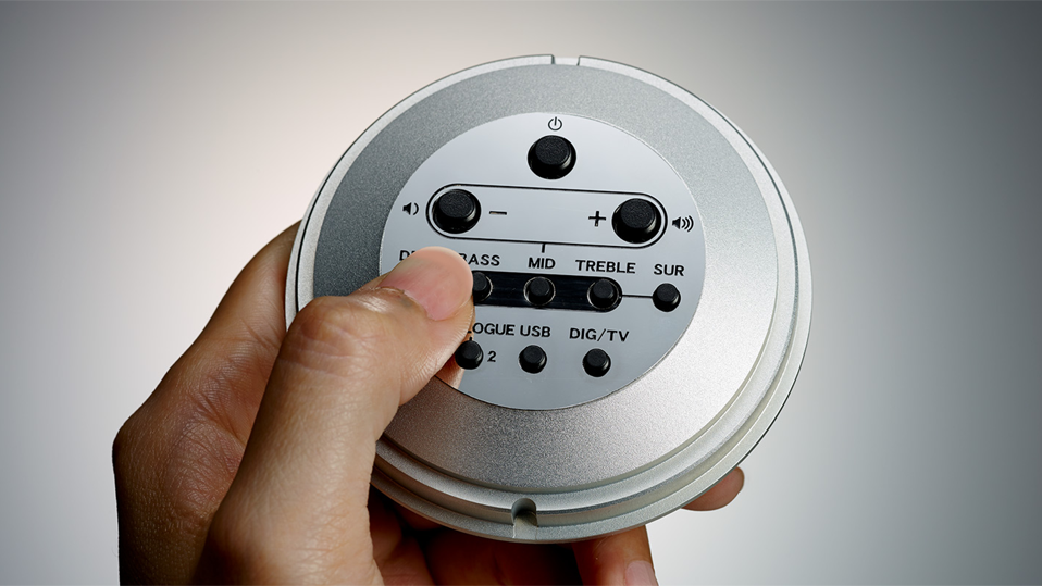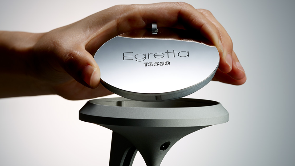 Egrettaシリーズのコンセプトである全方向360°無指向性の音楽再生は、スピーカーを設置した部屋全体をリスニングポイントとし、包みこむような音響空間を創造する。TS550は、床置きのTS1000に対して、卓上向けにリサイズすることで汎用性を高めた。小型スピーカーの弱点となる低音の音質不足も、スピーカーの筐体自体が担う「構造による低音増幅」により解消し、小型スピーカーとは思えない豊かな低音を奏でる設計となっている。リモコンを上冠部分にインテグレートできるデザインにすることで、使い勝手も配慮した。