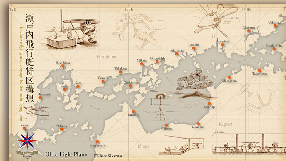 「瀬戸内飛行艇特区構想」は、GK-DSHが自主研究しているテーマの一つである。瀬戸内海は、世界でも稀な穏やかな波と多島美の風景を持ち、沿岸には様々な歴史や文化、産業が点在する。瀬戸内飛行艇特区構想は、こういった広域のエリアを俯瞰して見ることで得られる観光資源をひとつなぎにつなぐ構想である。Flying Yachtは、そんな特区構想のシンボルとなる飛行艇だ。船舶では得られないスピードと目線、航空機のように場所を限定しない発着拠点の自由さ、飛行艇は瀬戸内海を観光する上で最適な乗り物といえる。構想では、中型のFlyng yachtだけでなく、もっと小型の水上機や、ウルトラライトプレーンが登場し、さまざまなルートやアクティビティが生まれることを想定している。この構想の最終目標は、観光創造だけにとどまらず、飛行艇・水上機など特殊な航空機の製造、維持を通して、瀬戸内海エリアに点在する産業や技術の交流やイノベーションが生まれるところまでを目指している。