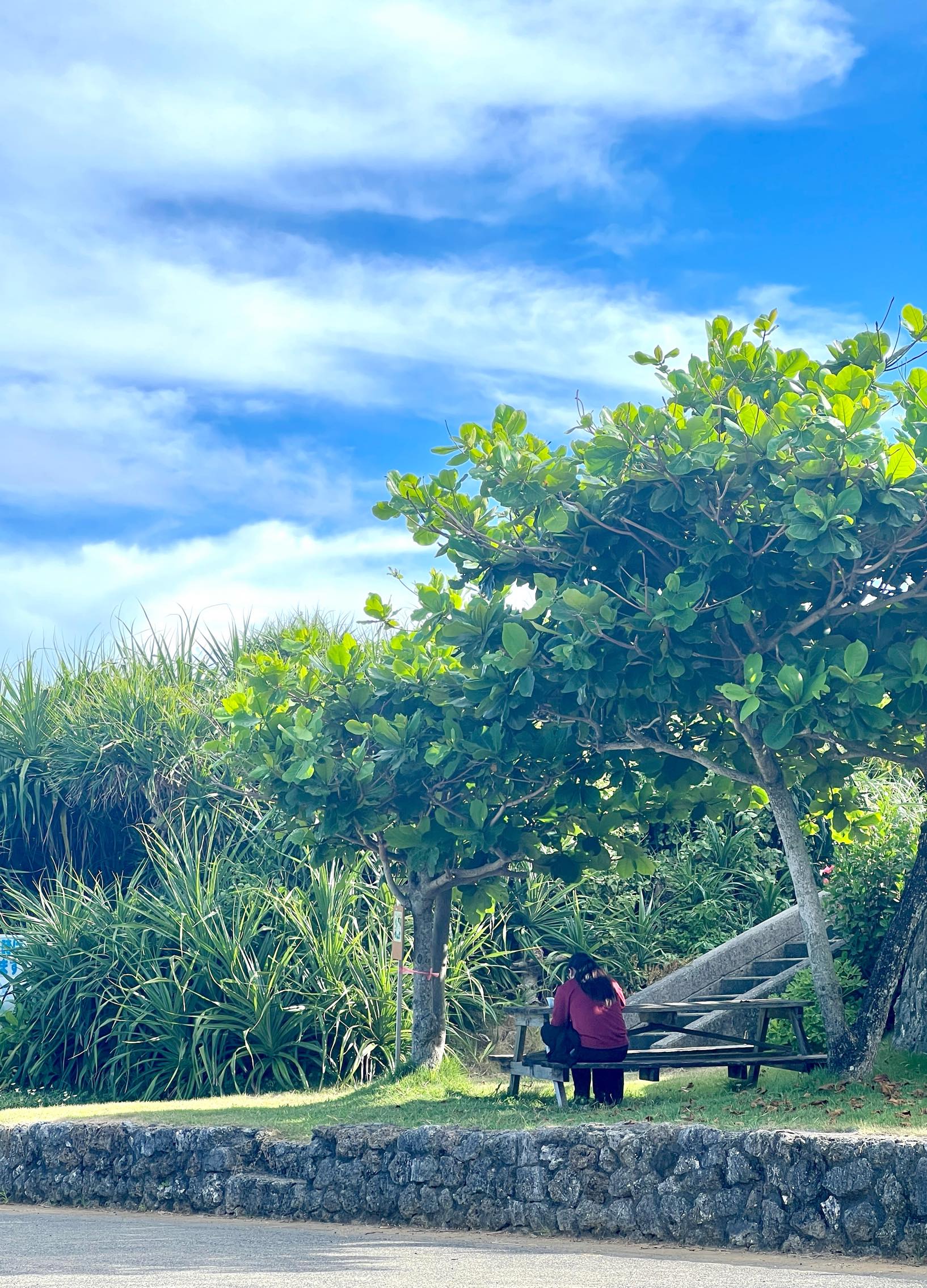 While driving, I happened to see a woman studying alone in the shade of a tree beside a small beach. The strong sunlight was kept out by a momotamana tree (Indian almond), where a cool and dry breeze was blowing through. And nearby, flowers planted by the villagers were in bloom. She apparently enjoyed her alone time, surrounded by a refreshing breeze and gentle sounds of waves.