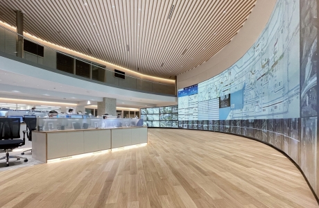 GK took charge of design and art direction for everything from the spatial structure using the lighting and coloring of the facility, GUI on displays, and staff uniforms. By employing Suyari-gasumi in different forms all over the place, we created a coherent atmosphere that loosely ties in the customers and Hitachi in their collaboration.