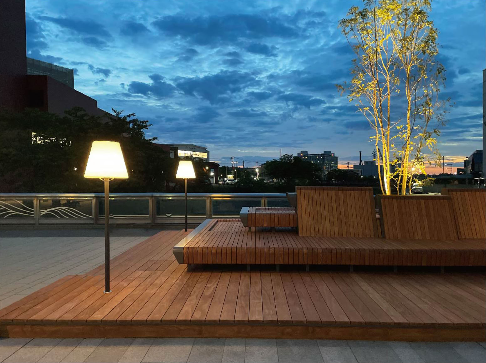 照明計画は、連続した照明柱ではなく、リビングのようにくつろげる緩急のある落ち着いた夜間景観を目指した。