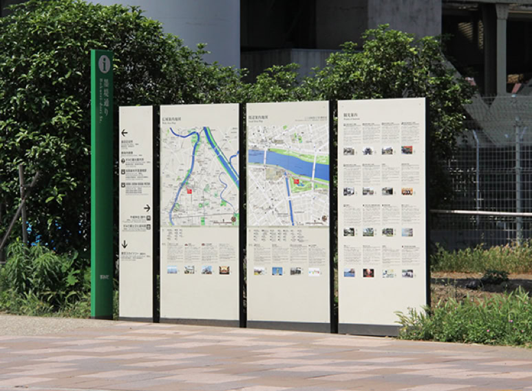 Sumida Ward has the area with the characteristic of history and culture like Ryogoku and Mukojima and the area in that the production of a new town is taking place around Tokyo Skytree. GK Sekkei made a signage plan for the town intending to improve the flow and excursion of the traffic in the town while having utilized the both of the charming characters of the areas.