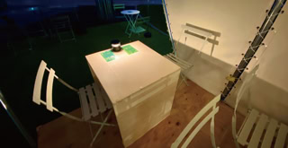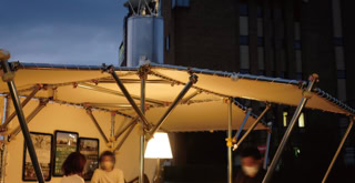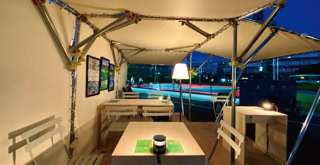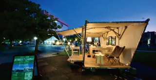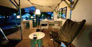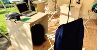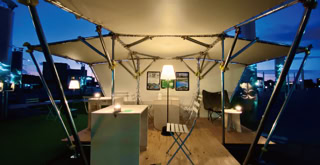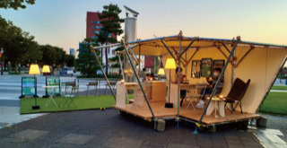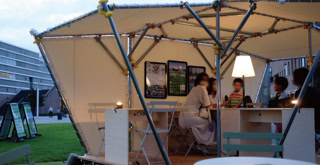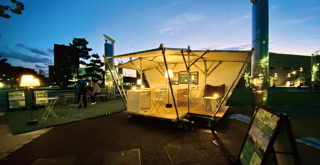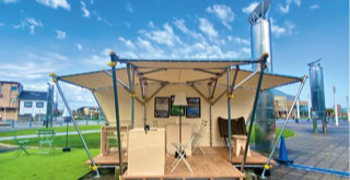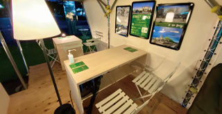 通常は箱型の形状をし、3方向の壁を開放することによりカフェのような空間になるほか、使用時以外は、テーブルやイス等を収納が可能です。また、移動することができ、イベントのレイアウトに応じた場所に設置することが可能です。