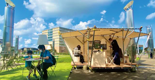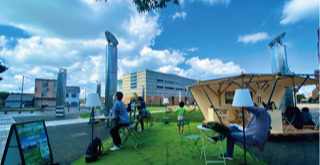 「ブールバール広場空間活用社会実験 STREET LIVING」では、 「芝生スペース」や「屋根のあるスペース」、「WiFi」、「コンセント」を設置し、 体験していただくことによるアンケートやセンサーによる利活用調査を行っています。
