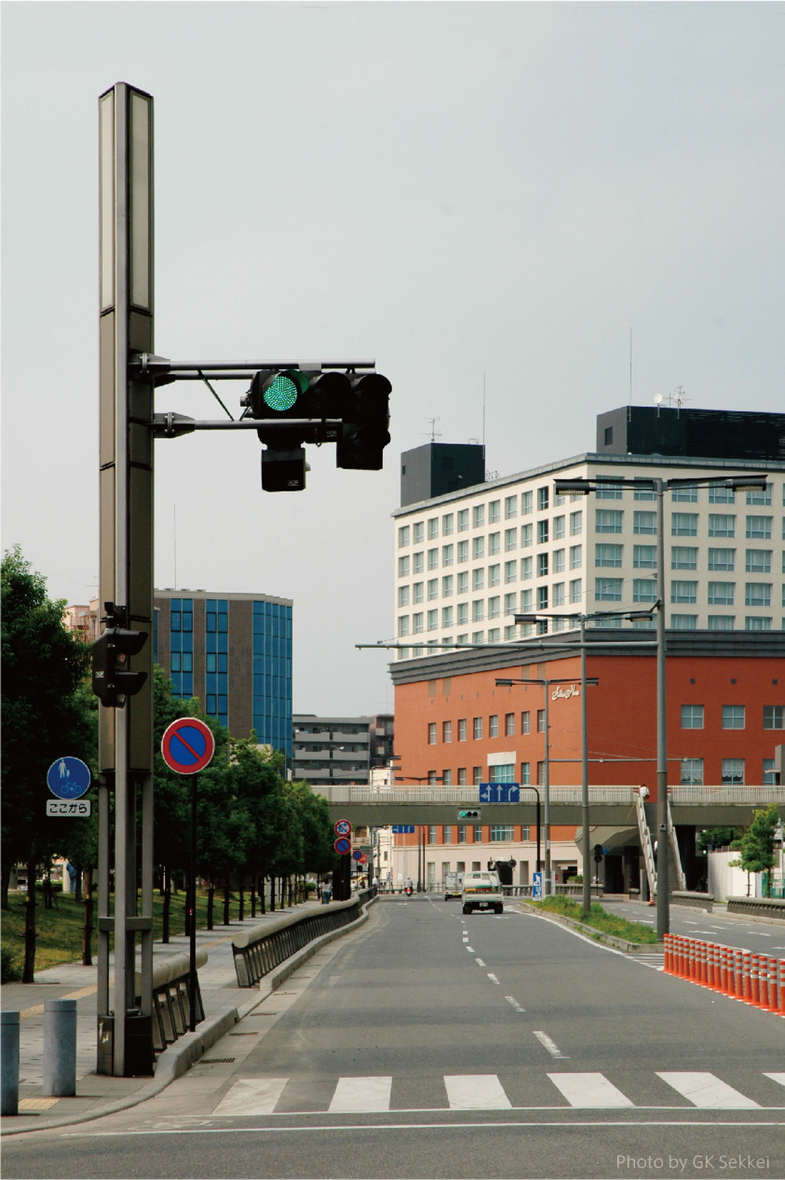 人工地盤の格子高欄と桁カバーに共架された信号機