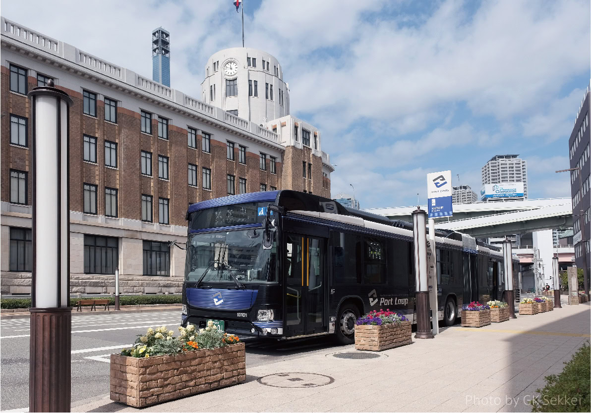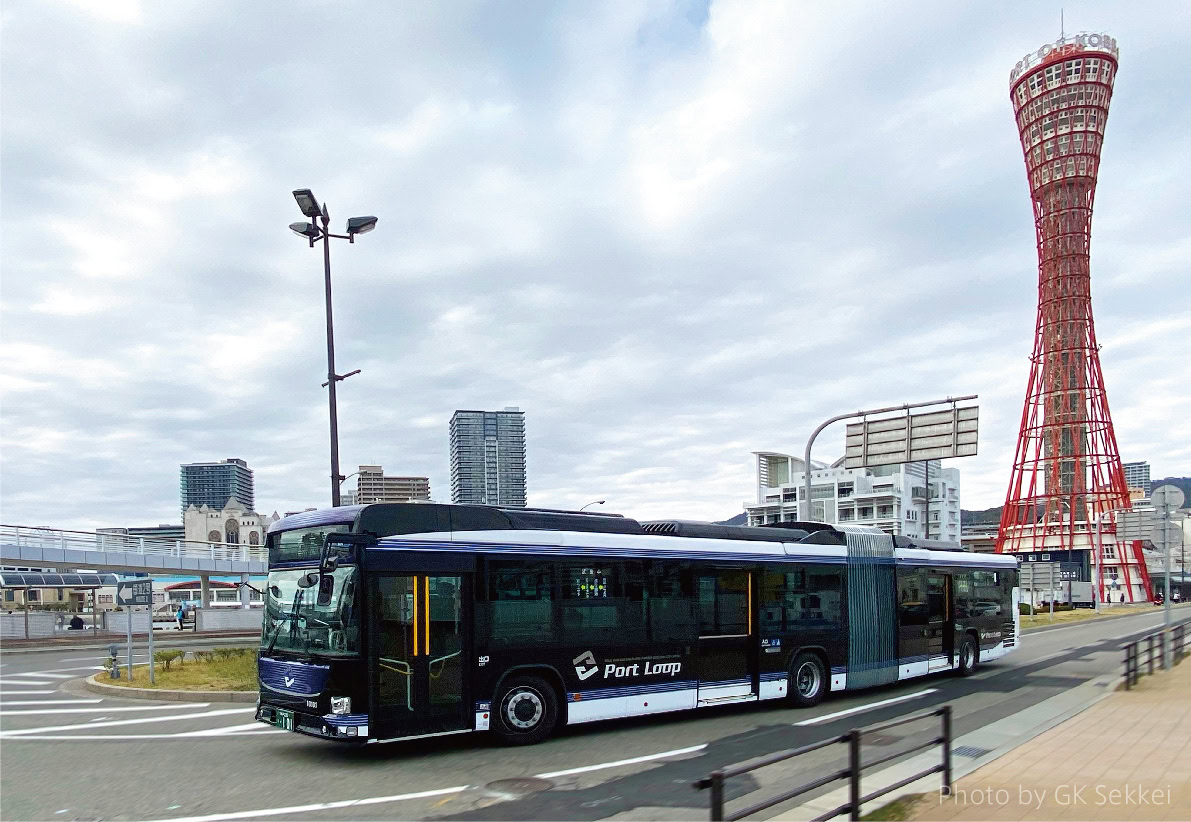 GK設計は、今春より、みなとまち神戸を走る連節バス「Port Loop(ポートループ)」のトータルデザインの協働プロデュースを行いました。