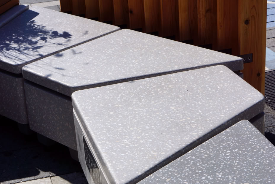 台形や菱形の本体や木製の座面パーツのレイアウト次第で、フレキシブルで多様な使い方が可能な滞留空間を作り出します。