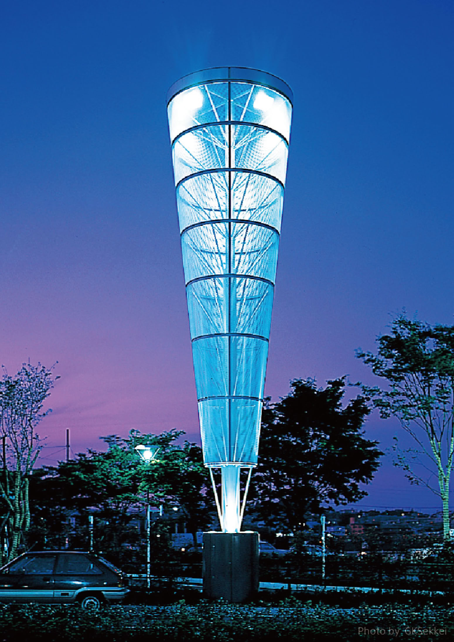 Tokaichiba is located inland of Yokohama City, 12 kn1 from downtown Yokohama, and 27 km from downtown Tokyo. The Tokaichiba Area in recent years has seen a rapid increase in population as a residential suburb of Yokohama, and it is also undergoing development as part of the Bunkyo Area. In celebrating the completion of the Tokaichiba City Lot Readjusting Project by Yokohama City, plaza surroundings of North Plaza and South Plaza were improved in 1989 and in 1992 respectively. In the plan, the design theme was set for "Market" which is the origin of the name of Tokaichiba and "Tree" considering the local characteristics and the history of Tokaichiba. Also a symbiosis between history and advancement was attempted, and creation of the plaza carrying the unique local atmosphere was planned. The bus shelter is the center of this project and its base unit consists of a variation on a gables intended to create a variety of expressions of light. Surrounding the plaza in a continuous mode creates a lively, dynamic and advanced scenery. Plaza lighting in the center of the rotary is located between three zelkova trees, and tree figures such as trunks and branches are used as the motif of the lighting structure design to show the contrast between nature and artifice. The surface is covered with aluminum punched metal to create expressions of day and night. By developing all the items from street furniture to plants and pavement designs under the theme of"Market" and "Tree", local identity was established and both plazas were designed as one unit. We hope that as a result of this improvement, the plazas will be able to expand into the city streets which spread from these plazas and blend into people's daily lives, instead of being used as closed space.