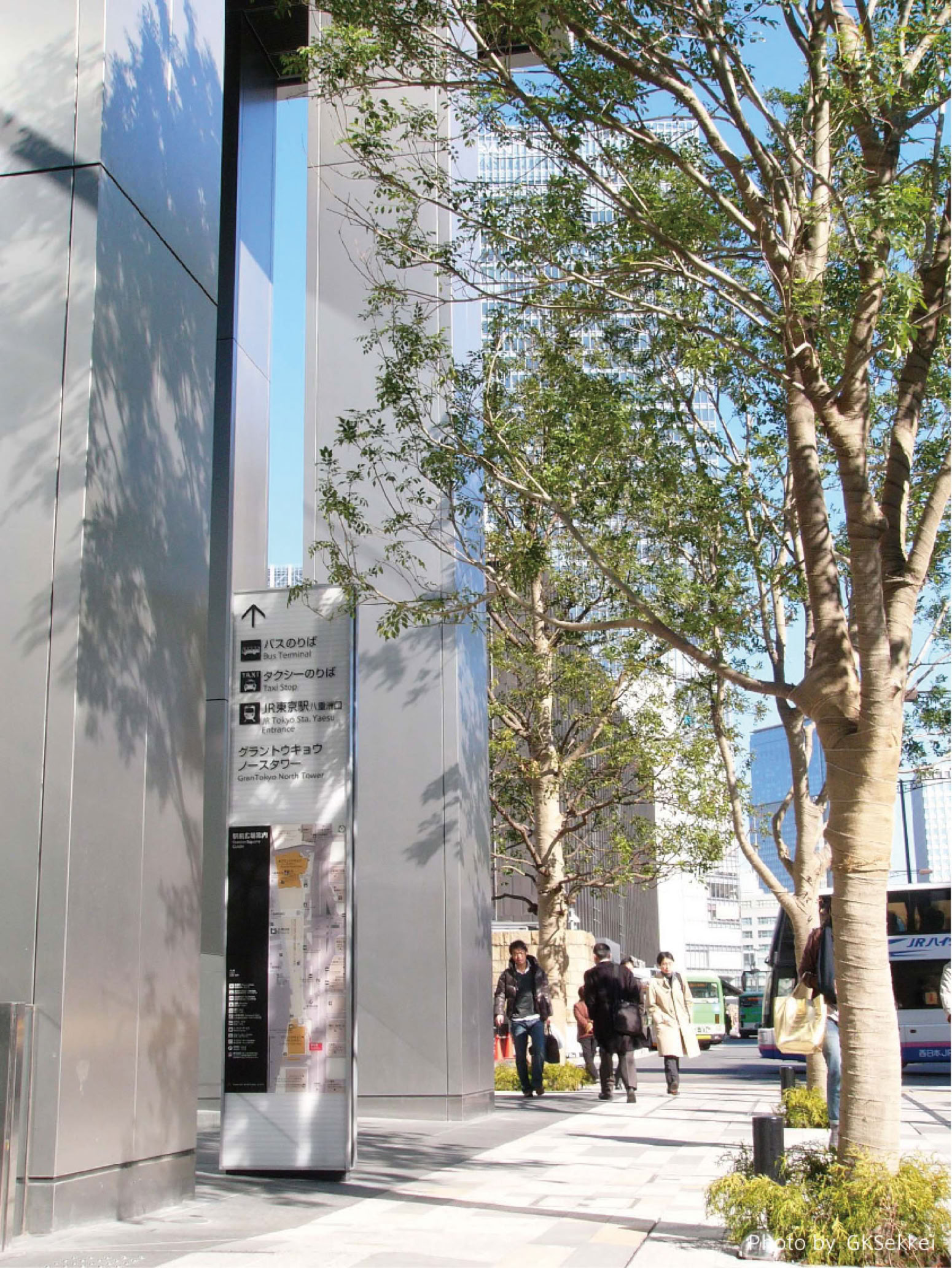 東京駅八重洲口の歩行者サイン計画及びデザイン業務。 八重洲口は東京駅の東の玄関口であり、高速バスや路線バスの集積するバスターミナル。